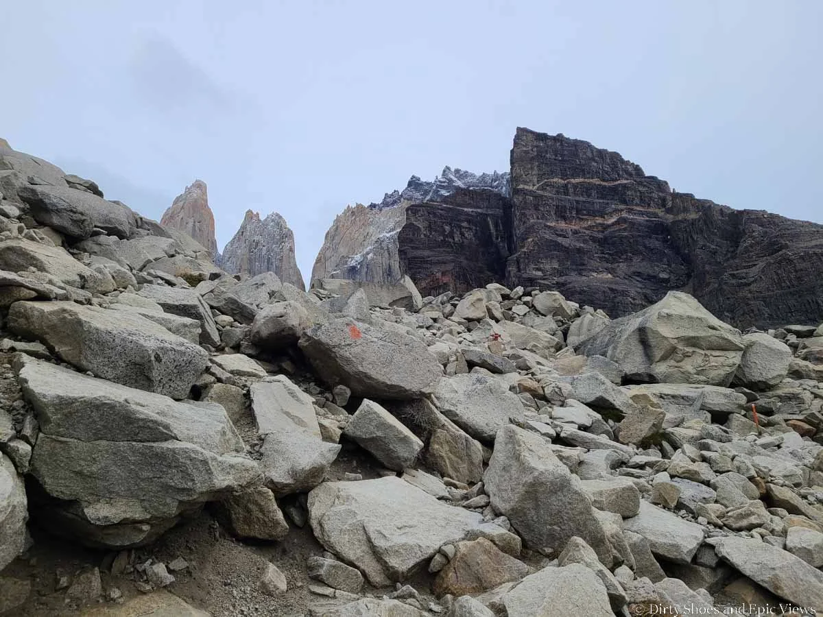 Near the Base Torres Lookout, the trail becomes a rock pile that you’ll be navigating using orange blazes and poles to keep you on track