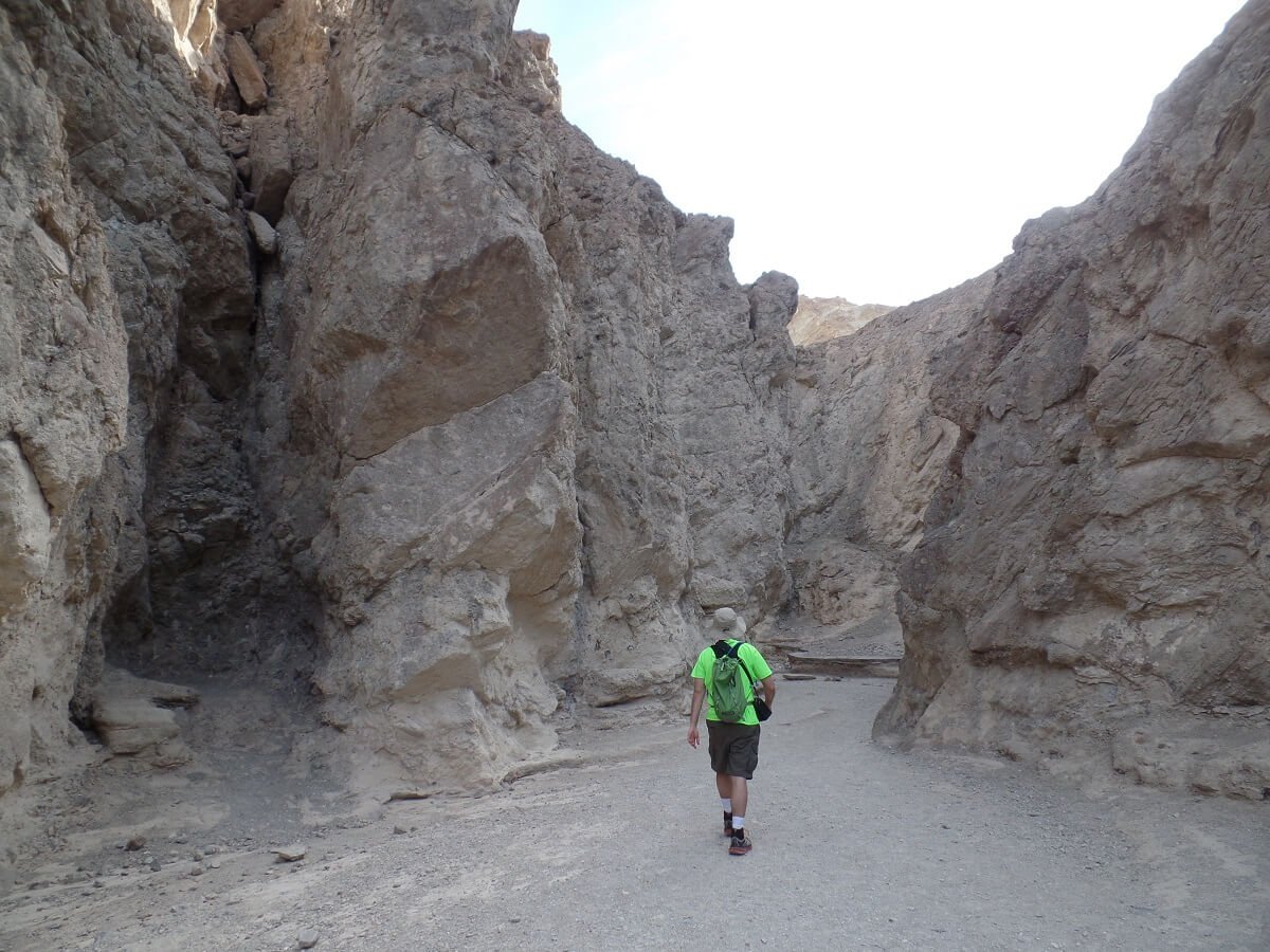 Hiking between the golden walls of the Golden Canyon trail in Death Valley