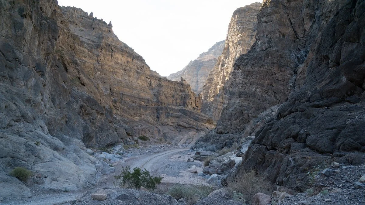 Titus Canyon Road as it weaves its way between the tall rock walls of the canyon@