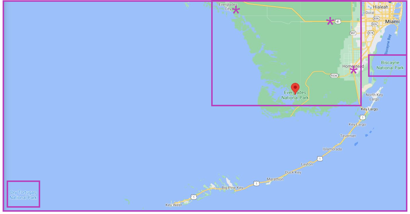 Location of the three Florida National Parks taken from Google Maps. The Everglades is quite large and has three separate entrances designated by the asterisks.