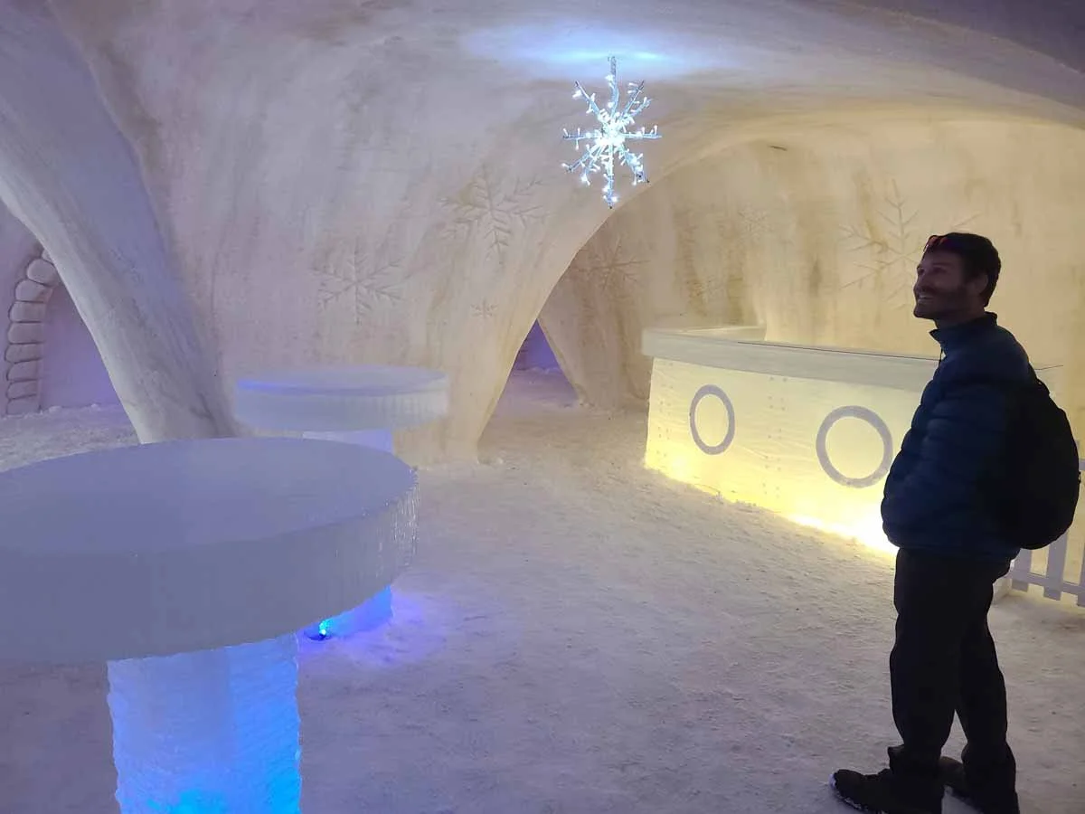 The exhibition room is basically a large warehouse-like space kept cold enough for snow and ice year-round. Inside, there are some big elaborate ice structures, a fun ice slide, and an ice bar with tables and chairs made of ice. It’s neat, and it’s a fun space for kids, but it really doesn’t take too much time to walk around and explore.