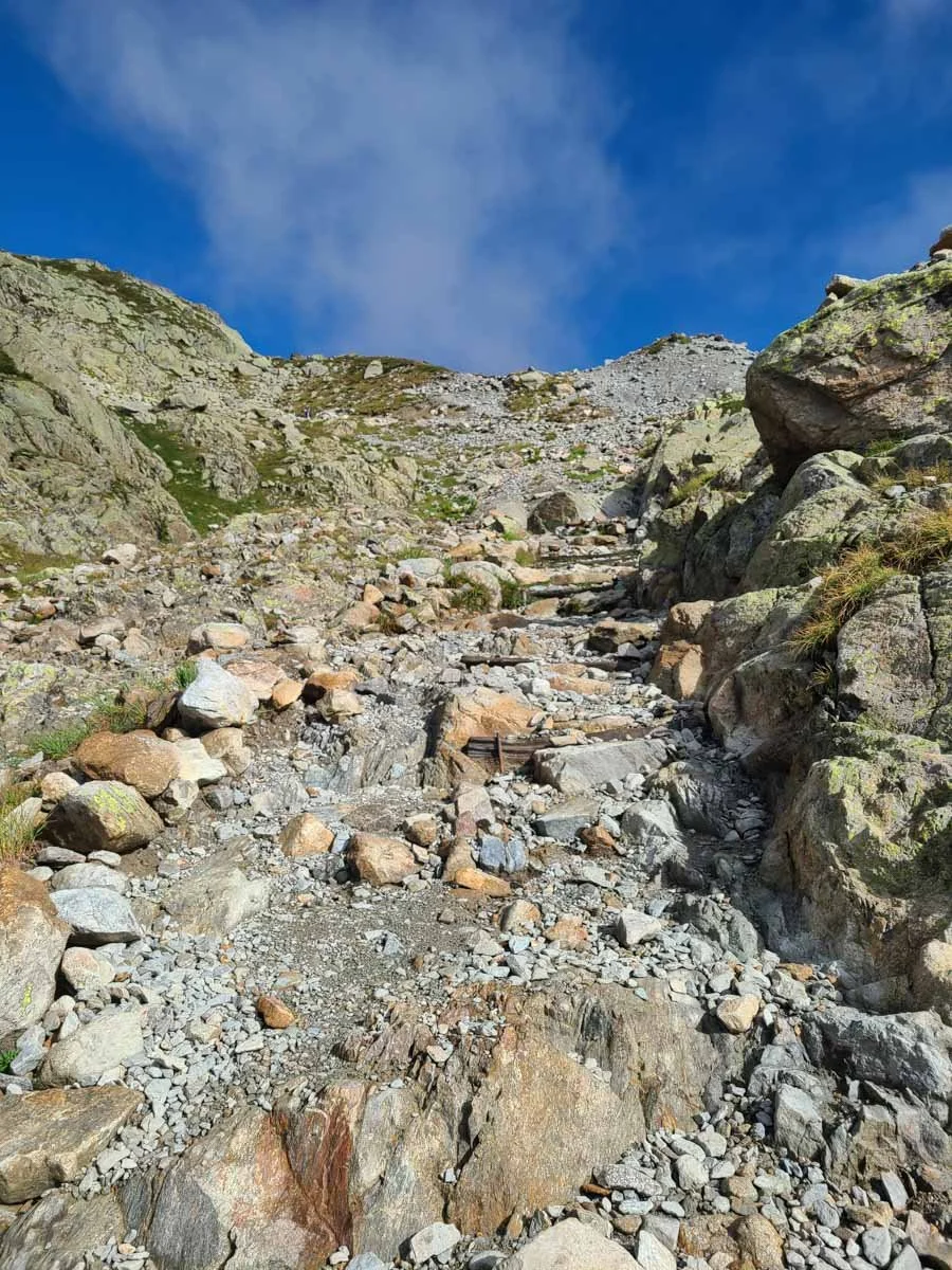 The trail between Lacs des Cheserys and Lac Blanc has a ton of these steep wooden stairs and loose rock