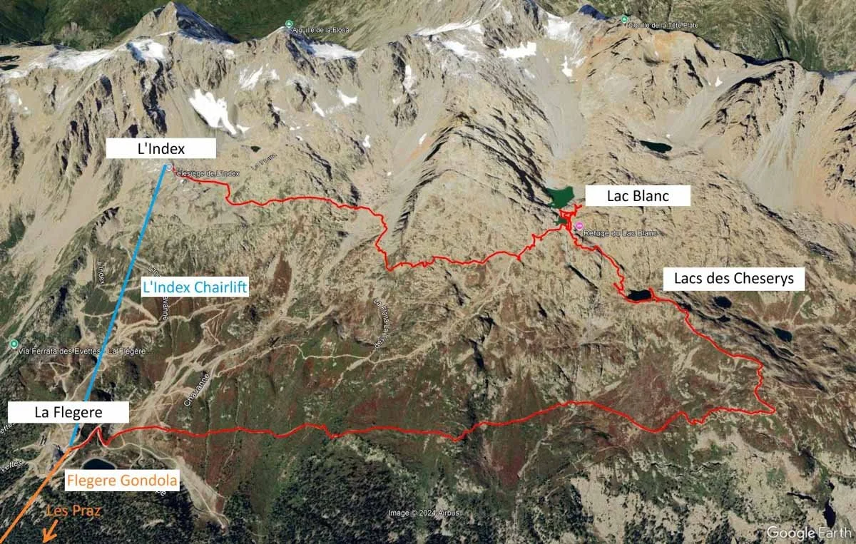 The different Lac Blanc trails (as well as the gondola and chairlift to Flegere and L’Index)