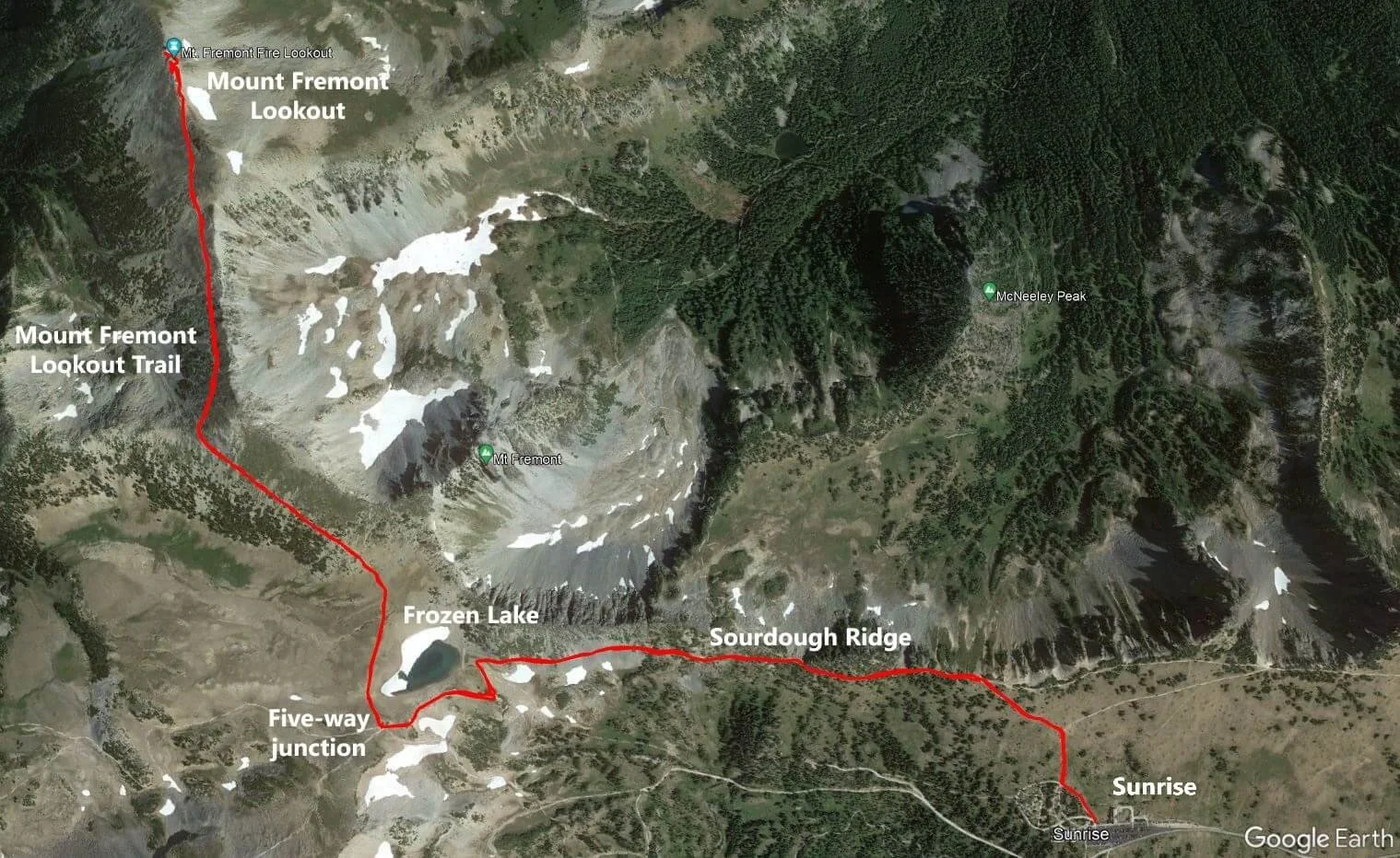 This is a satellite view of our hike to the Mount Fremont Lookout in Mount Rainier