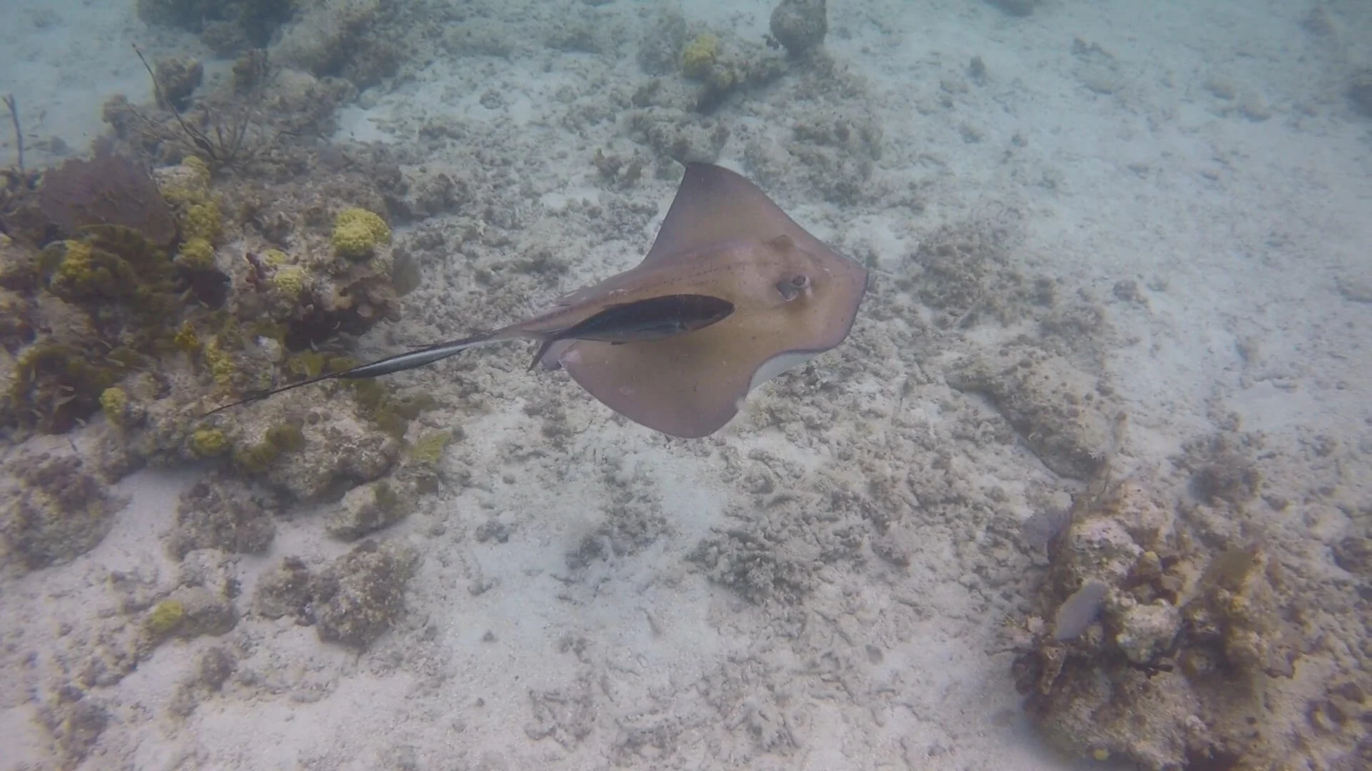 The entry into the water from this side of the bay starts off shallow, but it does get deep quickly. Immediately you might start to see some fish here, and not too long after we started swimming, we spotted the first (of many!) southern stingrays gliding along the ocean floor…it was super cool to see for the first time!